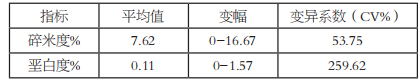 45個(gè)稻米樣品的碎米度平均值為7.62%,堊白度的平均值為0.11%,變異系數(shù)為259.62%,表明不同樣品間的堊白度差異較大,其中8號(hào)樣品最高。樣品6,9,11,12的碎米度和堊白度均較小,且其評(píng)級(jí)為優(yōu)質(zhì)一級(jí),表明外觀品質(zhì)優(yōu)良。