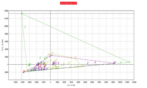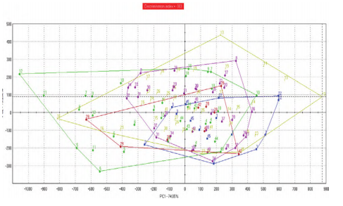 電子眼、電子鼻、電子舌的分析結(jié)果可以與人的感官評(píng)分結(jié)果進(jìn)行擬合,從而實(shí)現(xiàn)未知樣品外觀表型數(shù)據(jù)及香味強(qiáng)度值、滋味值的預(yù)測(cè),建立的聚類(lèi)分析模型,可實(shí)現(xiàn)產(chǎn)地溯源及品種鑒定等聚類(lèi)分析功能。通過(guò)同一樣品不同時(shí)期的數(shù)據(jù)采集,可以建立產(chǎn)品貨架期模型,實(shí)現(xiàn)對(duì)產(chǎn)品穩(wěn)定性的有效評(píng)價(jià)。