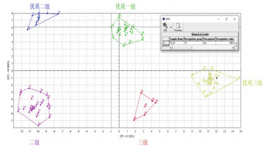 優(yōu)質(zhì)一二三級(jí)粳米對(duì)應(yīng)的品嘗評(píng)分值為90/80/70,單獨(dú)選擇優(yōu)質(zhì)一二三級(jí)樣品,并運(yùn)行DFA模型。模型圖(如圖8所示)中有部分區(qū)域重疊,說(shuō)明優(yōu)質(zhì)粳米間的滋味區(qū)分不明顯。其次是國(guó)標(biāo)中的品嘗評(píng)分值是結(jié)合了氣味/外觀結(jié)構(gòu)/適口性/滋味/冷飯質(zhì)地得到的綜合結(jié)果,數(shù)據(jù)的對(duì)應(yīng)上有所偏差。