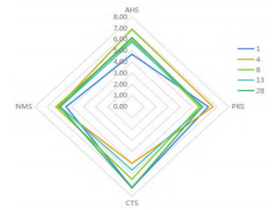 每個(gè)稻米樣品6次平行,計(jì)算各等級(jí)樣品AHS(酸味)、PKS(通用)、CTS(咸味)、NMS(鮮味)等4個(gè)味覺(jué)傳感器得分的平均值,得到雷達(dá)圖(如圖6所示)。不同等級(jí)稻米樣品對(duì)應(yīng)4個(gè)傳感器的得分離散程度較大,表明4種傳感器可以較好的區(qū)分不同等級(jí)的稻米樣品。其中優(yōu)質(zhì)一級(jí)(分組4)AHS、PKS得分最高,NMS、CTS最小,三級(jí)(分組28)CTS得分最高。