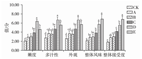 牛肉適口性得分受烹飪方法和煮熟程度的影響。對牛排從5個維度(嫩度、多汁性、外觀、整體風(fēng)味和整體接受度)進(jìn)行感官評價,分析成熟度對其感官品質(zhì)的影響,見圖1。