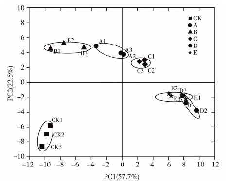 與樣品CK相比,部分化合物在樣品A、E中具有較高的含量,說明這部分物質(zhì)是烹飪后產(chǎn)生的,牛排在烹飪過程中由于高溫產(chǎn)生的美拉德反應(yīng)或者脂質(zhì)的熱分解產(chǎn)生的一系列揮發(fā)性風(fēng)味物質(zhì),導(dǎo)致烹制后的牛排風(fēng)味更豐富。