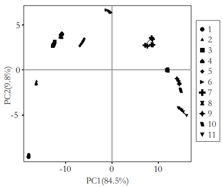 對(duì)11種樣品進(jìn)行電子眼的主成分分析(PCA),由圖1可知,PC1的貢獻(xiàn)率為84.5%,PC2的貢獻(xiàn)率為9.8%,2個(gè)主成分的總貢獻(xiàn)率為94.3%,可以用來(lái)解釋樣品絕大部分信息。各樣品之間離散分布,均無(wú)交叉重疊,表明電子眼能夠鑒定出各樣本的顏色差異。隨著苦蕎米添加量的增大,苦蕎米飯的顏色變得越來(lái)越暗沉,黃褐色加深,光澤越來(lái)越差。在主成分分析圖中隨著苦蕎米添加量的增加,樣本逐漸從X軸的左軸向右軸移動(dòng),表明隨著苦蕎米比例增加顏色呈現(xiàn)規(guī)律變化。由于主成分1的貢獻(xiàn)率較大,因此可以根據(jù)樣本在X軸上的距離判斷樣本之間的差異。3與4號(hào)樣品顏色相似,9~11號(hào)樣品顏色相似,其余樣品顏色差異較大。