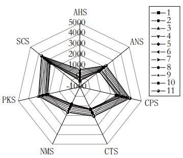 對(duì)所有樣品電子舌傳感器的響應(yīng)值繪制雷達(dá)圖(圖2),其中SCS傳感器、CPS傳感器的響應(yīng)值最高,其次是ANS傳感器、CTS傳感器、PKS傳感器的響應(yīng)值較高。通過(guò)味覺分析比較發(fā)現(xiàn)不同比例苦蕎米飯的滋味呈現(xiàn)一定的規(guī)律性,隨著苦蕎米添加量的增大,各傳感器的響應(yīng)值也隨之增大。上述結(jié)果表明,不同比例的苦蕎米飯滋味會(huì)因苦蕎米添加量的不同而逐漸變化。