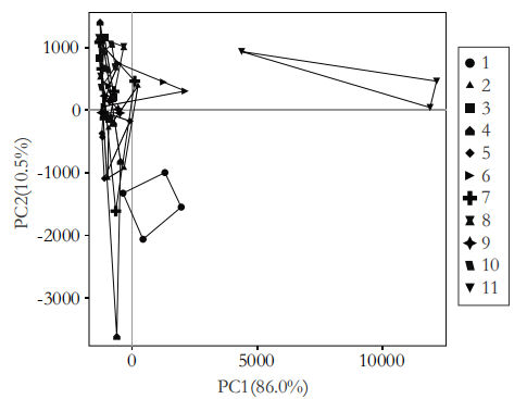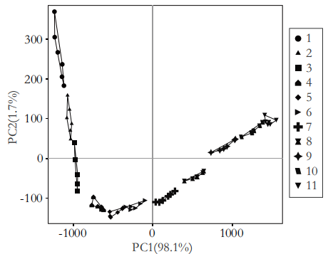 由圖3可知,第一和第二主成分貢獻(xiàn)率之和達(dá)到99.8%,即這2種主成分涵蓋了11組樣本絕大部分的原始數(shù)據(jù)信息,其中PC1的貢獻(xiàn)率為98.1%,PC2的貢獻(xiàn)率為1.7%,且樣本間的差異主要表現(xiàn)在第一主成分上。各樣本之間均無(wú)重合,表明電子舌技術(shù)能夠明顯地將不同比例苦蕎米飯區(qū)分。在PCA圖中隨著苦蕎米添加量的增加,樣本逐漸從X軸的左軸向右軸移動(dòng),各樣本在滋味上呈現(xiàn)一致規(guī)律,表明隨著苦蕎米比例增加滋味逐漸變化。由于PC1的貢獻(xiàn)率大,所以樣本在橫坐標(biāo)上的距離越大,表明了樣本之間的差異越大。結(jié)合圖2可知,苦蕎米添加量越高,酸味、咸味、鮮味、基本味的響應(yīng)值越大,與PCA圖的變化趨勢(shì)相對(duì)應(yīng),其中4號(hào)樣與3號(hào)樣品距離較遠(yuǎn),4號(hào)樣品開始出現(xiàn)滋味加重的現(xiàn)象,與3號(hào)樣品差異明顯。