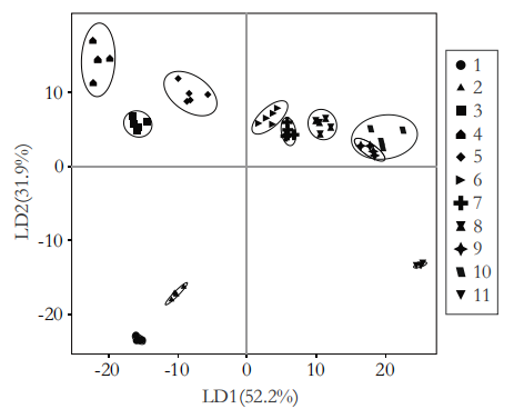 由于圖4中樣本間相互重疊,組內(nèi)樣品分布離散,分類效果并不理想,PCA不能區(qū)分樣本間的差異,故進(jìn)行線性判別分析(LDA)。LDA結(jié)果如圖5所示。由圖5可知,LD1的貢獻(xiàn)率為52.2%,LD2的貢獻(xiàn)率為31.9%,其累計(jì)貢獻(xiàn)率為84.1%,能夠反映樣品中的大部分氣味信息。1、2、11號(hào)樣本與其余樣本距離較遠(yuǎn),表明了1、2、11號(hào)樣本與其余樣本之間的差異較大。6~10號(hào)樣本距離較近,存在部分重疊現(xiàn)象,說(shuō)明這幾組樣本氣味相似,并且隨著苦蕎米添加量的增大,樣本呈現(xiàn)出從左向右依次移動(dòng)的趨勢(shì)。1、2號(hào)樣本米飯的香味較重、苦蕎的香味較淡,苦蕎香味從3號(hào)樣本開始逐漸明顯,11號(hào)樣本苦蕎味過(guò)重。綜上所述,電子鼻結(jié)合線性判別分析可較好地區(qū)分不同比例苦蕎米飯。