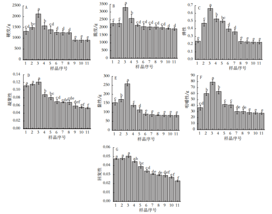 在苦蕎米添加量增大的過(guò)程中,影響著米飯的質(zhì)構(gòu)特性,這使得添加不同比例苦蕎米的口感也各不相同。由圖6可知,苦蕎米飯的硬度、脆度、彈性、凝聚性、黏性、咀嚼性、回復(fù)性均隨苦蕎米添加量的增大呈現(xiàn)先上升后下降的趨勢(shì)。3號(hào)樣品的硬度、脆度、彈性、凝聚性、黏性、咀嚼性、回復(fù)性分別呈現(xiàn)最大值,且顯著高于其余樣品。其中,3號(hào)樣品凝聚性、回復(fù)性與1、2號(hào)樣品無(wú)差異。由此可知,3號(hào)樣品的質(zhì)構(gòu)特性最佳,適當(dāng)?shù)靥砑涌嗍w米會(huì)增強(qiáng)米飯的質(zhì)構(gòu)特性,但添加量過(guò)大則會(huì)降低米飯的質(zhì)地,影響口感。