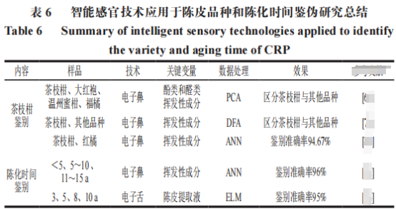 智能感官技術(shù)作為新興的快速分析技術(shù),采用電子傳感器模擬生物的嗅覺及味覺系統(tǒng),從而使樣品的檢測客觀化、智能化。其中的電子鼻和電子舌技術(shù)應(yīng)用于陳皮品種和陳化時(shí)間鑒偽的研究總結(jié)見下表。