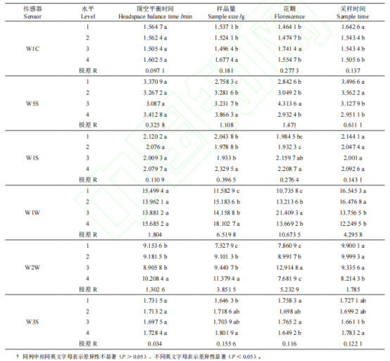 不同因素對(duì)電子鼻各傳感器(W1C、W5S、W1S、W1W、W2W和W3S傳感器)的影響見表1。從表3可知,不同因素對(duì)電子鼻測(cè)定櫻花花香的影響差異顯著,對(duì)電子鼻傳感器的響應(yīng)影響從大到小依次是不同花期、樣量、采樣時(shí)間,在不同頂空平衡時(shí)間因素下電子鼻各傳感器響應(yīng)極差均最小。從各因素的不同水平看,在不同頂空平衡時(shí)間因素中,水平1、4高于水平2、3;樣品量中水平4的電子鼻各傳感器響應(yīng)值顯著高于其他水平,水平1、2、3差異不顯著;在不同花期因素下,除了W1S傳感器之外,其余傳感器在水平3時(shí)的響應(yīng)值高于其他水平,且與其他水平差異極顯著;采樣時(shí)間中各水平差異不顯著。說明電子鼻對(duì)盛開時(shí)期的櫻花花朵且樣品量為4g時(shí)響應(yīng)較大。