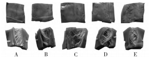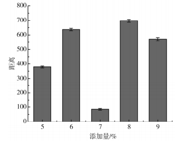 樣品原料擠壓前為金黃色,擠壓過程中高溫條件的非酶促褐變反應(yīng),例如美拉德反應(yīng)和焦糖化反應(yīng),以及辣椒的顏色混合導(dǎo)致擠出物具有紅棕色。由圖1可知,隨著辣椒添加量的增加,樣品的紅色越來越深,樣品表面及內(nèi)部的辣椒顆粒分布均勻并且越來越明顯。隨著辣椒添加量的增加,樣品中條狀纖維也越來越明顯。辣椒添加量小于7%時,樣品的拉絲性隨著辣椒添加量的增加越來越好,在辣椒添加量大于7%后,樣品的拉絲性隨著辣椒添加量的增加越來越差。