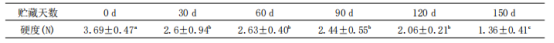 由表2可知,隨著凍藏時間的延長,紅燒肉的硬度持續(xù)降低,其中30d凍藏與新鮮的紅燒肉有顯著變化(P<0.05),30d至90d無顯著變化(P>0.05),而貯藏120d和150d與此前均有顯著變化(P<0.05)。凍藏30d,紅燒肉的硬度即明顯下降,凍藏150d自然解凍后的紅燒肉硬度下降至1.36N,這可能是因?yàn)閮霾剡^程中冰晶對肌細(xì)胞和肌肉纖維的破壞程度加重,引起豬肉中結(jié)合水和不易流動水的遷移與損失,從而引起紅燒肉質(zhì)構(gòu)品質(zhì)發(fā)生劣變。