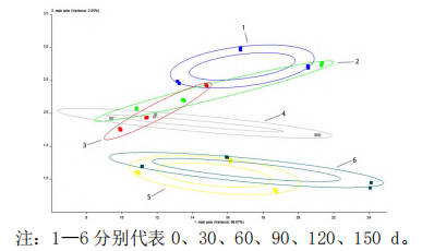 采用主成分PCA分析法,對新鮮紅燒肉至150d凍藏周期的PCA分析結(jié)果見圖4。新鮮紅燒肉至90d凍藏周期均有相交或重疊的部分,而與120d和150d凍藏的沒有相交部分,表明新鮮,30、60、90d凍藏紅燒肉的氣味不能顯著地區(qū)分開,而120d和150d凍藏的與前面的香氣組分能顯著區(qū)分,有所衰減。說明了紅燒肉氣味隨凍藏時間的延長,前期變化小,而120d后風(fēng)味有所衰減,但衰減程度不大。