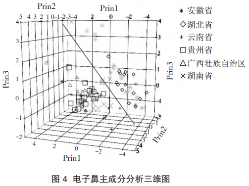 電子鼻主成分分析的結(jié)果表明,前三個主成分的特征值均大于1,其累積貢獻(xiàn)率達(dá)95.05%,由圖4可知,安徽和湖北的茯苓樣品存在較大的重疊,云南、貴州、廣西和湖南的樣品重疊更為嚴(yán)重。