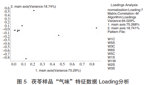 Loadings分析的算法與PCA的算法相同,是對傳感器的分析,得出傳感器區(qū)分樣品的能力。由圖分析可推測,各產(chǎn)地的茯苓樣品在氣味上的差異主要來自于無機(jī)硫化物、有機(jī)硫化物、甲基類化合物和氮氧化合物。