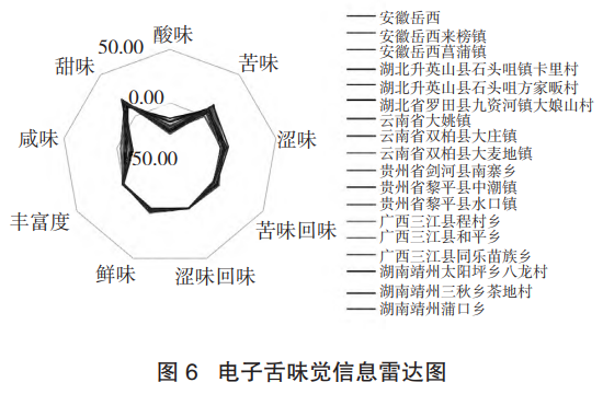 不同于以往人們對茯苓滋味的認(rèn)識,茯苓樣品除咸味、酸味外,其他的味覺屬性基本都在無味點以上,說明茯苓具有豐富的味覺信息。茯苓最突出的味道是甜味和苦味。另外,不同產(chǎn)地茯苓的某些味覺屬性在雷達(dá)圖上重疊度較低,如酸味、澀味和苦味的回味,但各個產(chǎn)地的樣品酸味響應(yīng)值在無味點-13以下,見圖6。