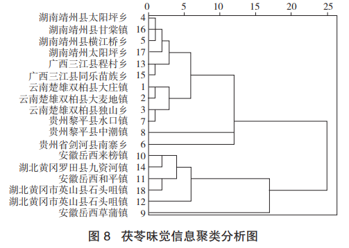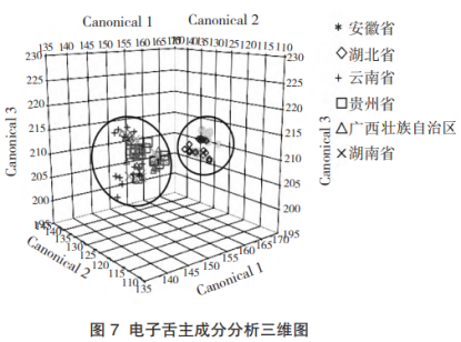 圖7為電子舌檢測結(jié)果的響應(yīng)值降維后所得的主成分分析結(jié)果??傮w來看,西南地區(qū)(云南、廣西、貴州)的茯苓樣品與岳西地區(qū)(安徽、湖北)的茯苓樣品能夠得到大致劃分。