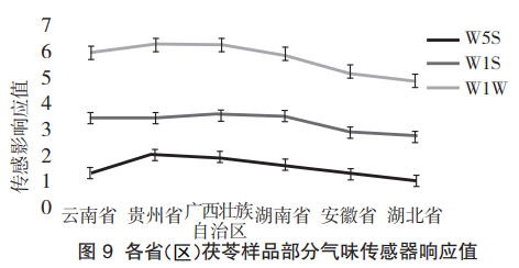 從茯苓氣味的PCA分析結(jié)果可知,在地理位置上以長江為分界點,能有效區(qū)分長江以北和長江以南的茯苓樣品。云南、貴州、廣西、湖南的樣品生長和采收于長江以南,湖北和安徽的樣品生長和采收于長江以北。根據(jù)雷達(dá)圖可知,W5S、W1S和W1W傳感器響應(yīng)值較高,Loadings分析結(jié)果顯示茯苓氣味的差異主要來源于無機(jī)硫化物、有機(jī)硫化物、甲基類化合物和氮氧化合物。因此選擇對上述氣味靈敏的傳感器進(jìn)一步分析茯苓氣味的產(chǎn)地差異,結(jié)果如圖9所示,安徽和湖北的茯苓樣品氣味響應(yīng)值顯然低于云南、貴州、廣西、湖南的樣品,說明長江以北和長江以南的樣品在無機(jī)硫化物、有機(jī)硫化物、甲基類化合物和氮氧化合物氣味成分上存在較大差異。