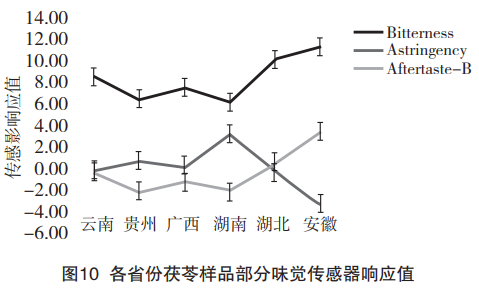 茯苓味覺信息的雷達(dá)圖分析可知,茯苓甜味顯著,但各產(chǎn)地之間差異不顯著。各產(chǎn)地的茯苓樣品味覺值的差異主要集中在苦味、澀味和苦味的回味上。因此,選擇苦味、澀味、苦味的回味進(jìn)行分析探討產(chǎn)地之間的差異,結(jié)果如圖10所示。由圖可知,湖北和安徽的茯苓樣品苦味和苦味的回味都顯著高于長江以南——云南、貴州、廣西、湖南的茯苓樣品,且湖北和安徽的茯苓樣品苦味的回味在無味點0以上,長江以南的樣品苦味的回味都在無味點以下。對于澀味,長江以北的茯苓澀味在無味點以下,而長江以南的茯苓澀味都在人的無味點以上。