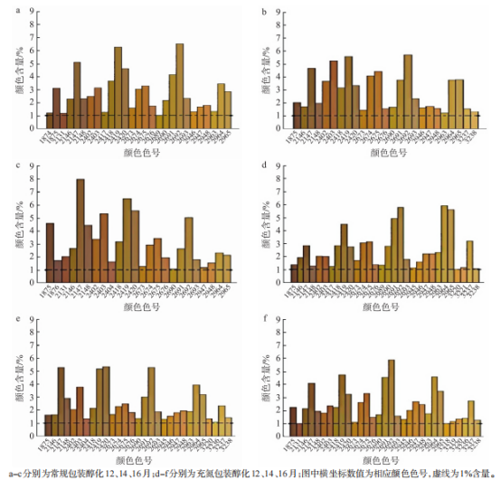 對(duì)常規(guī)和充氮包裝下醇化片煙樣品進(jìn)行電子眼分析,對(duì)相近顏色歸一化處理,形成顏色分布結(jié)果(圖1)。從圖1可以看出,6個(gè)不同醇化片煙的顏色主要有48種,分布于黃色到褐色范圍,且存在差異。其中,常規(guī)包裝醇化煙葉的黃褐色和橄欖褐色分布較高,而充氮包裝醇化煙葉的深黃色和深橘黃色分布比例較高。