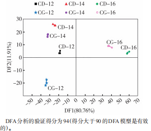為進(jìn)一步分析不同包裝方式醇化片煙香氣成分的差異,對(duì)3個(gè)醇化期不同包裝方式的片煙樣品揮發(fā)性成分指紋圖譜進(jìn)行了判別因子分析(DFA),結(jié)果如圖5所示。電子鼻的判別因子影響值總和為92.67%(DF1為80.76%,DF2為11.91%),驗(yàn)證得分94。從DFA模型圖中可以看出,醇化12、14月時(shí),兩種包裝煙葉的氣味主要在DF2有明顯區(qū)別;而醇化16月時(shí),充氮包裝與常規(guī)包裝的片煙在DF1和DF2均有差別。整體來看,DFA判別模型結(jié)果與氣味指紋圖譜的PCA分析結(jié)果相吻合,說明通過電子鼻能有效區(qū)分不同包裝方式醇化片煙樣品揮發(fā)性成分的差異。