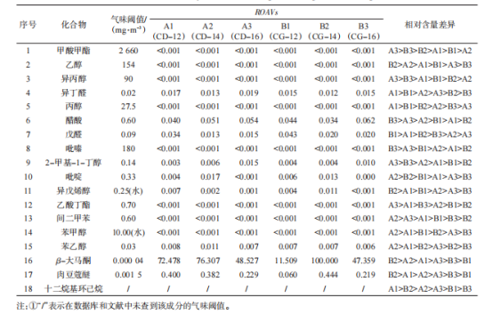 為確定差異揮發(fā)性化合物對(duì)醇化片煙氣味的貢獻(xiàn)程度,篩選出的主要差異化合物進(jìn)行ROAV分析,采用面積歸一化法計(jì)算化合物的相對(duì)含量,采用AroChembase數(shù)據(jù)庫(kù)和文獻(xiàn)中檢索到的化合物氣味閾值為嗅覺閾值。18種主要差異化合物中,β-大馬酮的相對(duì)含量較高,且嗅覺閾值較低,因此定義CG-14中的β-大馬酮(相對(duì)含量最高)的ROAV值為100。