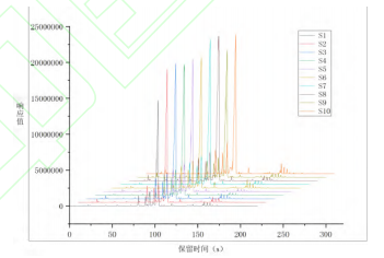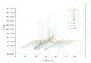 利用電子鼻對(duì)10種不同產(chǎn)地草果樣品進(jìn)行的檢測(cè)分析及后續(xù)數(shù)據(jù)處理,獲得了在MXT-5色譜柱和MXT-1701色譜柱上的氣味指紋圖譜,結(jié)果如圖2、圖3所示,觀察到不同產(chǎn)地草果的氣味成分色譜峰在出峰時(shí)間和峰面積上均呈現(xiàn)出明顯差異。若通過(guò)比對(duì)放大色譜圖來(lái)尋找樣品組間的差異,此過(guò)程較為繁瑣與復(fù)雜。為了提高分析效率,故采用先統(tǒng)計(jì)后化學(xué)分析的方法,首先,通過(guò)PCA法對(duì)不同產(chǎn)地草果樣品的氣味進(jìn)行統(tǒng)計(jì)分析,識(shí)別氣味上的差異。在PCA分析的基礎(chǔ)上,進(jìn)一步確定差異色譜峰。隨后,利用AroChembase數(shù)據(jù)庫(kù)對(duì)這些差異色譜峰進(jìn)行定性分析。