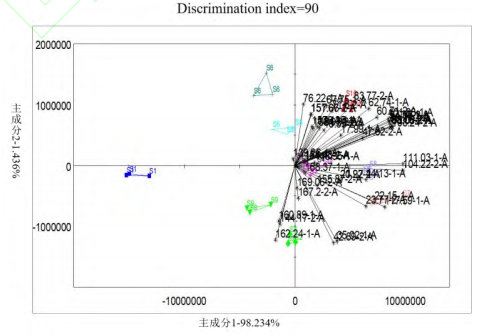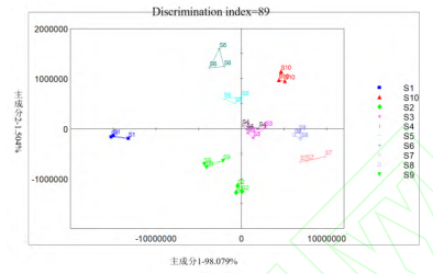 主成分分析(Principal Component Analysis,PCA)是一種常用統(tǒng)計(jì)分析方法,它可以將多個(gè)變量轉(zhuǎn)換為少數(shù)幾個(gè)主成分,從而簡(jiǎn)化數(shù)據(jù)分析。本研究使用PCA算法對(duì)電子鼻采集的原始數(shù)據(jù)進(jìn)行分析,通過(guò)計(jì)算主成分識(shí)別指數(shù)(Discrimination Index,DI)和貢獻(xiàn)率來(lái)識(shí)別變量。通過(guò)PCA分析,可以有效地揭示不同產(chǎn)地草果樣品氣味特征的差異。第一主成分(PC1)與第二主成分(PC2)的區(qū)分貢獻(xiàn)率之和為99.58%(圖4),表明這兩個(gè)主成分足以解釋10種不同產(chǎn)地草果樣品間的絕大部分的氣味差異,驗(yàn)證了PCA模型能夠非常好地反映不同產(chǎn)地草果樣品間的氣味差異。識(shí)別指數(shù)(DI)是一種量化指標(biāo),用于衡量數(shù)據(jù)集或?qū)嶒?yàn)結(jié)果中不同樣品或樣本之間的區(qū)分度。DI的數(shù)值大小直接關(guān)聯(lián)于數(shù)據(jù)集中樣本間的差異性。DI值越大,表示數(shù)據(jù)集中不同樣品或樣本之間的區(qū)分度越高,即模型或?qū)嶒?yàn)方法的區(qū)分效果越好。草果樣品在主成分分析圖上的DI值達(dá)到89,進(jìn)一步表明基于氣味特征的差異可以有效地區(qū)分10種不同產(chǎn)地的草果樣品。