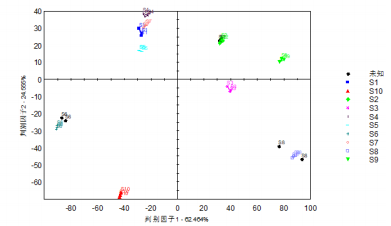 在主成分分析基礎(chǔ)上,對(duì)10種不同產(chǎn)地草果樣品進(jìn)行判別因子分析,分析結(jié)果如圖8顯示,判別因子1判別指數(shù)為62.46%,判別因子2判別指數(shù)為24.56%,不同產(chǎn)地草果樣品組內(nèi)分布集中且離散程度小,組間分布離散程度大,表明該分析方法能夠有效地區(qū)分不同產(chǎn)地的草果樣品。進(jìn)一步地,將3種不同產(chǎn)地的草果未知樣本的圖譜信息投射到已建立的DFA模型中,每種未知樣本均設(shè)置了兩組重復(fù)。如圖8所示,通過(guò)模型判定,3種未知樣本分別被準(zhǔn)確歸類到S2、S6和S8三個(gè)不同的產(chǎn)地。具體到每個(gè)未知樣本,歸屬于S2產(chǎn)地的樣本識(shí)別準(zhǔn)確率分別為98.9%和99.2%,歸屬于S6產(chǎn)地的樣本識(shí)別準(zhǔn)確率分別為95.5%和94.2%,而歸屬于S8產(chǎn)地的樣本識(shí)別準(zhǔn)確率分別為81.7%和97.2%。這些結(jié)果表明,DFA模型對(duì)于未知草果樣品的判別具有較高的準(zhǔn)確性。因此,基于DFA模型的分析,可以快速而準(zhǔn)確地鑒定草果的產(chǎn)地,為草果的產(chǎn)地溯源提供了一種有效的技術(shù)手段。