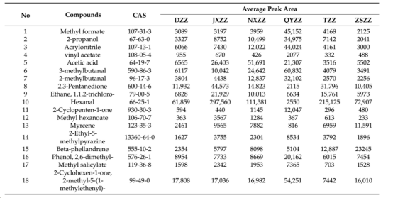 如表1所示,共鑒定出18種VOCs。為更直觀地比較不同產(chǎn)地梔子果實(shí)樣品中VOCs含量的差異,以VOCs為橫軸、平均峰面積為縱軸繪制了差異化合物含量柱狀圖(如圖5所示)。圖5數(shù)據(jù)顯示,梔子果實(shí)中VOCs的化學(xué)組成相對相似,但不同產(chǎn)地梔子果實(shí)的同一化學(xué)成分含量差異巨大,表明不同產(chǎn)地梔子果實(shí)品質(zhì)存在差異。從柱狀圖可見,最顯著的特征是屈原梔子,其甲酸甲酯、2-丙醇、丙烯腈、乙酸乙烯酯、乙酸和3-甲基丁醛等11種化合物含量最高,但己醛和月桂烯含量低于其他五個(gè)樣品。寧鄉(xiāng)梔子含量變化相對穩(wěn)定,其乙酸含量高于其他樣品。梔子果實(shí)中含量最高的化合物是己醛,其中金溪梔子樣品含量最高,其次是唐河梔子。金溪梔子中2,3-戊二酮、乙烷和1,1,2-三氯乙烷含量高于其他樣品,而樟樹梔子中月桂烯和β-水芹烯含量高于其他樣品。唐河梔子中2,3-戊二酮、乙烷、1,1,2-三氯乙烷和己醛含量相對較高,而其他化合物含量較低。東鄉(xiāng)梔子未表現(xiàn)出任何顯著高于其他梔子果實(shí)樣品的成分,其化合物含量普遍低于其他樣品。