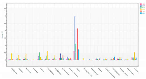 本研究利用Heracles Neo超快氣相電子鼻技術(shù)分析六個(gè)批次梔子果實(shí)樣品的VOCs,建立了梔子果實(shí)快速檢測方法,共鑒定并分析了18種VOCs。經(jīng)驗(yàn)證,PCA和DFA兩個(gè)模型均發(fā)現(xiàn)不同產(chǎn)地梔子果實(shí)間存在明顯的VOCs差異。這使得基于氣味信息快速鑒別不同產(chǎn)地梔子果實(shí)成為可能。在六個(gè)批次梔子果實(shí)樣品中,屈原梔子與其他樣品差異最大,其甲酸甲酯、2-丙醇、丙烯腈等化合物含量較高,而己醛含量極低。金溪梔子和唐河梔子的VOCs相近,且金溪梔子中己醛和2,3-戊二酮含量較高。東鄉(xiāng)梔子、寧鄉(xiāng)梔子和樟樹梔子樣品的VOCs相對接近。唐河梔子中己醛含量較高,而寧鄉(xiāng)梔子中乙酸含量較高。乙酸、3-甲基丁醛、2,3-戊二酮和己醛可能是導(dǎo)致不同產(chǎn)地梔子果實(shí)VOCs差異的重要化合物。