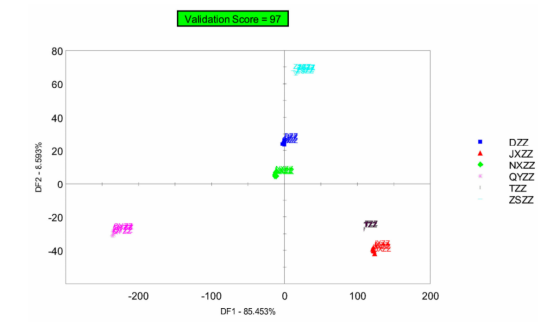 判別因子分析(DFA)是一種確定個(gè)體所屬類別的統(tǒng)計(jì)分析方法。它通過兩個(gè)或多個(gè)已知類別的樣本數(shù)據(jù)優(yōu)化這種區(qū)分,最大化組間距離的同時(shí)確保用于定性判斷的組內(nèi)差異最小。在PCA基礎(chǔ)上進(jìn)行DFA,可通過減小組內(nèi)差異來擴(kuò)大組間差異,從而使不同產(chǎn)地的梔子果實(shí)樣品更易區(qū)分。結(jié)果如圖6所示。