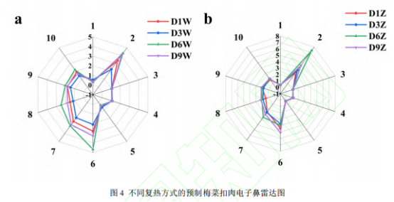 風味輪廓的電子鼻分析電子鼻分析通過傳感器模擬生物嗅覺系統(tǒng),以客觀、靈敏地區(qū)分食物的揮發(fā)性氣味。D1W、D3W、D6W、D9W和D1Z、D3Z、D6Z、D9Z的雷達圖如圖4所示,分別代表微波復熱和蒸汽復熱組在貯藏第1、3、6、9d的電子鼻響應。兩種復熱方式的梅菜扣肉均對R3烯烴類、R4硫化物、R5硫的有機化合物傳感器響應值較低且變化不大,表明在貯藏期間梅菜扣肉的這些風味物質(zhì)含量相對穩(wěn)定。如圖4所示,兩種復熱方式下,R2、R6、R7、R8傳感器的響應值均相對較高,說明梅菜扣肉中的主要風味成分為氨類、氮氧化合物、氫化物以及烷類。在微波復熱中,貯藏3d時這4類物質(zhì)的響應最弱,而貯藏6d時的響應最強。這可能是因為微波的快速升溫會瞬間激活這些初始風味物質(zhì)或微量副產(chǎn)物,使其快速釋放。貯藏3d時各組分的劣變程度還未達到一定的閾值。當貯藏時間增加到6d時,肌肉蛋白發(fā)生劣變使氨基酸脫氨基生成氨類物質(zhì)。而脂肪氧化或脂肪酸分解會生成氮氧化合物和烷類物質(zhì),此外,梅菜中的含硫氨基酸分解會生成氫化物(如硫化氫)。值得注意的是,梅菜扣肉在貯藏6d時用蒸汽復熱后,R2氨類的響應值較高,這可能與肌肉蛋白的肽鍵逐步水解有關(guān)。此外,蒸汽復熱組大部分響應值隨著貯藏天數(shù)的變化相對平穩(wěn),反映出其風味變化更為緩和。